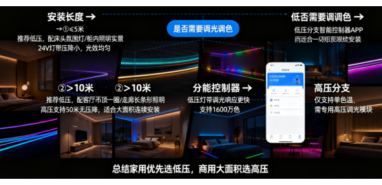 总结:若你是DIY爱好者,或仅需局部装饰(如橱柜、床头),低压灯带的“即插即用”更友好;若需全屋吊顶、商业橱窗等长距离照明,高压灯带的“一灯到底”更省心,但需投入更多安装成本。