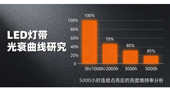 在LED照明技术迅猛发展的今天,LED灯带凭借其安装便捷、装饰性强、能耗低等优势,已广泛应用于家居装饰、商业照明、户外景观等领域。然而,随着使用时间的延长,LED灯带的亮度会逐渐下降,这种现象被称为"光衰"。光衰不仅影响照明效果,更直接关系到产品的使用寿命和用户体验。本文通过对某品牌高品质LED灯带进行5000小时连续点亮实验,深入分析其光衰曲线特征及亮度维持率变化规律,为消费者选购和行业技术优化提供科学参考。