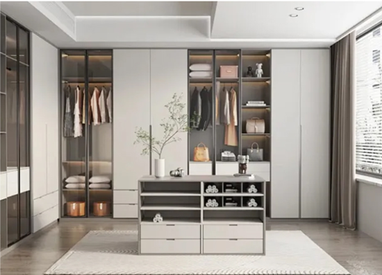 ·激光封边:高端定制首选工艺,封边带自带涂胶层,通过激光高温熔融与板材无缝融合,无任何胶线痕迹,质感细腻高级,颜值与实用性兼具,尤其适合柜门定制,能显著提升整体空间质感。