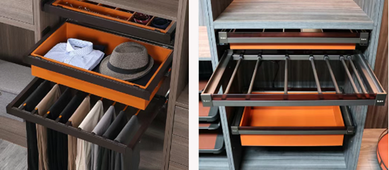 导轨也有讲究。小抽屉用三节轨就够了,轻便顺滑;大抽屉、厨房柜,一定要选托底阻尼轨,承重力强,不容易出轨,放重东西也不用担心。柜门高度超过2.4米,必须加拉直器。