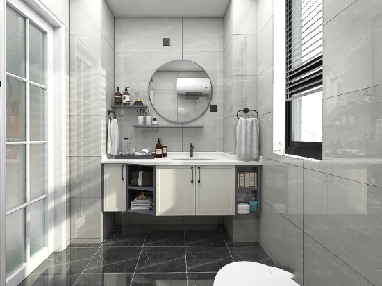 卫生间主灯设置在距离地面130cm,距离门边15cm的位置。距离浴室柜台面20cm上方设置插座,平常可用于吹风机和剃须刀等小家电。