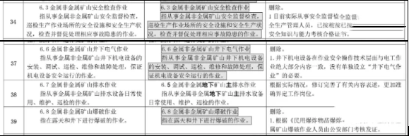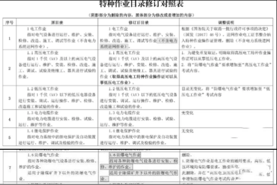 1.电工作业类别。删除“防爆电气作业”1 个操作项目,将相关要求融入“高压电工作业”“低压电工作业”操作项目。明确取得高压电工特种作业操作证可以从事低压电工作业。【截图如下↓↓点击图片可放大查看】