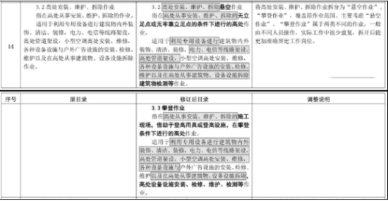 1.高处作业类别。将原“高处安装、维护、拆除作业”拆分为“悬空作业”和“攀登作业”2 个操作项目。