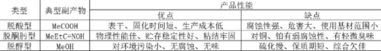 硅酮胶从包装瓶(膜)挤出后,迅速接触到空气中的水分子并发生反应,根据交联剂与端羟基聚二甲机硅氧烷产生的小分子的不同种类,硅酮密封胶可以分为脱酮肟型、脱酸型、脱醇型、脱酰胺型、脱丙酮型、脱羟胺型以及脱胺型等7种硅酮胶产品。目前国内建材市场常用的硅酮胶为脱酸型、脱酮肟型和脱醇型三大类。