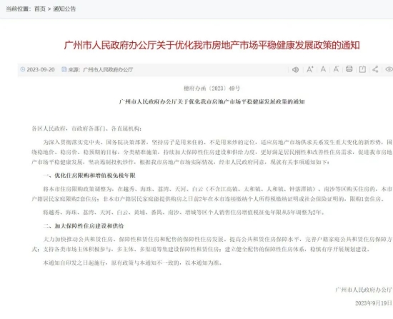 9月20日晚,广州发布《广州市人民政府办公厅关于优化我市房地产市场平稳健康发展政策的通知》,也由此广州成为全国一线城市中,第一个部分放开限购的城市。