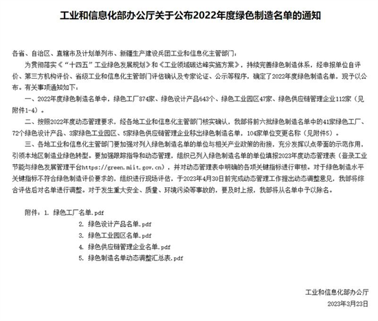 绿色制造名单是为贯彻落实《“十四五”工业绿色发展规划》和《工业领域碳达峰实施方案》,持续完善绿色制造体系,经申报单位自评价、第三方机构评价、省级工业和信息化主管部门评估确认及专家论证、公示等程序后产生的。绿色制造名单分为四类:绿色工厂、绿色设计产品、绿色工业园区、绿色供应链管理企业。
