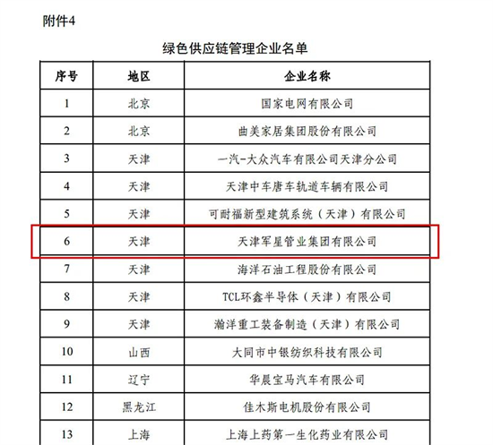 日前,工业和信息化部公布了2022年度绿色制造名单,天津军星管业集团有限公司成功入选国家级“绿色供应链管理企业”榜单。这也是继入选2021年度绿色制造名单获得“绿色工厂”称号后的又一项荣誉。