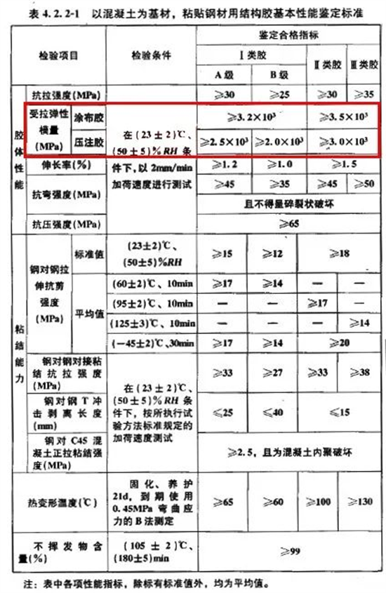 很多厂商就在这一点上打主意,宣称自己生产的加固材料弹性模量超高,加固中的战斗机!真的是这样吗?请注意,我们鉴定材料基本性能并不只是弹性模量一个指标,另外还有强度、伸长率、抗剪切方面的鉴定。强度很容易与刚度混淆,它是指材料在外力作用下抵抗破坏(变形和断裂)的能力。下面我们拿结构涂布胶来举例说明,如图3所示,其抗拉弹性模量,Ⅰ类胶3.2×10³Mpa,Ⅱ类胶3.5×10³Mpa,Ⅰ类胶A级伸长率1.2%,Ⅰ类胶B级伸长率1.0%,Ⅱ类胶伸长率1.5%,Ⅰ类胶A级抗剪强度,Ⅰ类胶B级抗剪强度14Mpa,Ⅱ类胶不抗剪。由上面参数可以得出,虽然Ⅰ类胶弹性模量不占优势,但是综合其他力学参数来看,Ⅰ类胶的性能是优于Ⅱ类胶。如果材料不容易发生形变,但却很容易被拉断或剪切,这就是有了刚度但没有强度,这在加固上是行不通的,如果使用了这样的材料就不能达到真正意义上的加固。所以好材料必须是高弹性模量、高强度配上适当的伸长率、剪切强度才能真正发挥加固的作用。