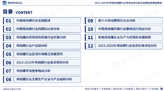 由智研咨询专家团队精心编制的《2023-2029年中国母线槽行业市场全景评估及发展前景展望报告》(以下简称《报告》)重磅发布,《报告》旨在从国家经济及产业发展的战略入手,分析母线槽行业未来的市场走向,挖掘母线槽行业的发展潜力,预测母线槽行业的发展前景,助力母线槽业的高质量发展。