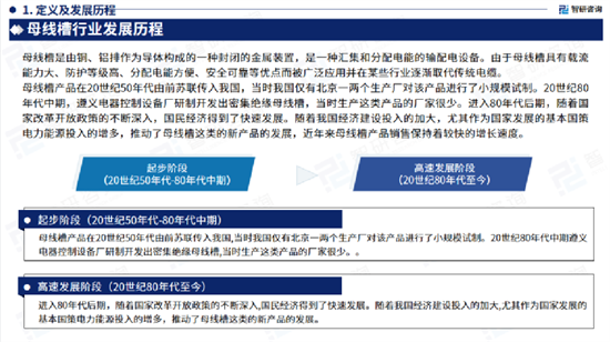 母线槽产品在20世纪50年代由前苏联传入我国,当时我国仅有北京一两个生产厂对该产品进行了小规模试制。20世纪80年代中期,遵义电器控制设备厂研制开发出密集绝缘母线槽,当时生产这类产品的厂家很少。进入80年代后期,随着国家改革开放政策的不断深入,国民经济得到了快速发展。随着我国经济建设投入的加大,尤其作为国家发展的基本国策电力能源投入的增多,推动了母线槽这类的新产品的发展,近年来母线槽产品销售保持着较快的增长速度。