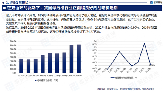 数据显示,2015-2022年我国母线槽行业市场规模增速呈现波动态势,2022年行业市场规模增速为0.90%。2014年我国母线槽行业市场规模367.58亿元,到2022年市场规模增长到了724.37亿元。