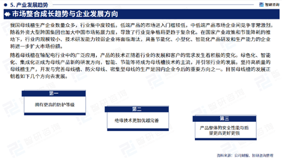 我国母线槽生产企业数量众多,行业集中度较低,低端产品的市场进入门槛较低,中低端产品市场企业间竞争非常激烈。随着外资大型跨国集团也加大中国市场拓展力度,导致了行业竞争格局更趋于复杂化。在国家产业政策和节能降耗的推动下,行业内规模较小、技术研发能力较弱企业将面临淘汰,具备节能化、小型化、智能化产品研发和生产能力的企业将进一步扩大市场份额。坚持高质量的母线槽生产,开发与完善母线槽、防火母线、密集型母线的生产是国内企业今后的重要方向之一。