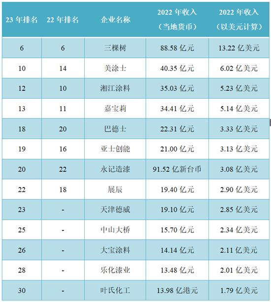 以当地货币计算,上述13家中国公司2022年的涂料业务销售收入分别为88.58亿元、40.35亿元、35.03亿元、34.41亿元、22.31亿元、21.00亿元、91.52亿新台币、19.40亿元、19.10亿元、15.70亿元、14.14亿元、13.48亿元、13.98亿港元。上榜中国企业总收入为53.15亿美元,仅占榜单总收入的17.0%。