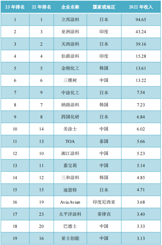 2023年亚太涂料企业30强榜单(单位:亿美元)