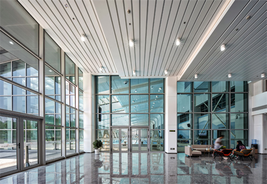 建筑形体简洁,体型系数达0.15。设计提升南朝向的窗墙比,减少北朝向的窗墙比,以提高太阳得热系数。围护结构结合钢结构,以及金属面岩棉夹芯一体板外挂体系;外窗及玻璃幕墙采用高性能被动窗(断桥铝合金双银Low-E+12 Ar+6 mm+12 Ar+6 mm,传热系数1.550 W/㎡,K<1.60,太阳得热系数为0.280);为防止夏季太阳直射辐射过强,在南向幕墙和屋顶天窗部分均设置了可调节的电动遮阳帘。