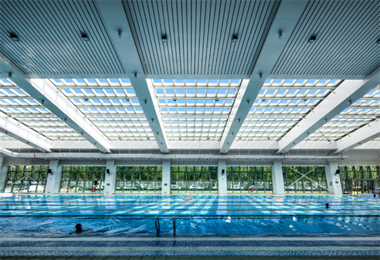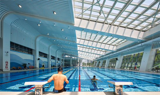 经过反复论证,笔者团队最终选择了主动式建筑路径,即追求建筑的“呼吸”性能——建筑可以自我感知,自动调节,具备能动性,让项目成为一座可“呼吸”的场馆。项目建成后的实际能耗尚待跟踪监测,但毫无疑问这是一座超低能耗游泳馆:池水在阳光下波光粼粼,水波荡漾,微风拂面,有种自然水域中光随影动的美好。该项目获得了国内第一座近零能耗游泳馆建筑认证和中国第一个体育场馆类AH国际认证。