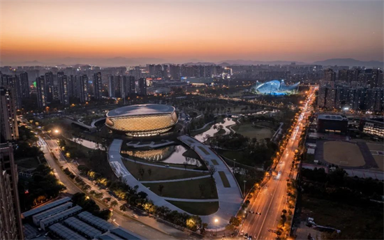2021年4月26日,位于浙江省杭州市拱墅区的运河亚运公园项目正式竣工。该项目由浙江省建筑设计研究院和美国Archi-Tectonics公司联合设计,是一个集休闲绿地、体育场馆、商业街区于一体的大型综合性城市公园。主要建筑包括“国球中心"体育馆(2022年杭州亚运会乒乓球、霹雳舞竞赛馆)、“杭州伞"体育场(2022年杭州亚运会曲棍球竞赛场)、全民健身中心、全媒体中心等。