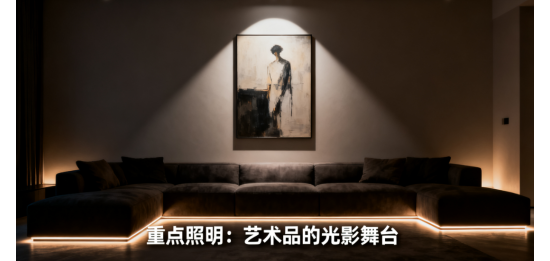 一级焦点(核心视觉):客厅艺术挂画(7W射灯,4000K,CRI97显色指数)、主卧床头背景墙(RGBW灯带,支持色温与色彩自定义);