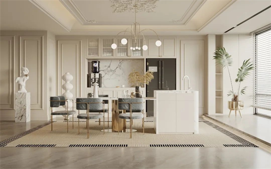餐厅是一家人三餐都要聚集的地方,为了留出足够的过道空间,嵌入式餐边柜是比较合适的设计。墙面与柜门齐平,嵌入式餐边柜增加储物空间的同时,也维持了餐厅的干净整洁。
