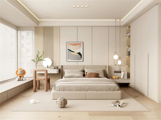 针对卧室的想象,体验感应排在首位。嵌入式一门到顶衣柜将收纳空间极大扩充,同时不会阻碍视线,实现充分的采光。将柜体的绝大部分都嵌入墙体之中,打造“隐藏式”收纳,更加节省空间,同时使得卧室更具有整体性。