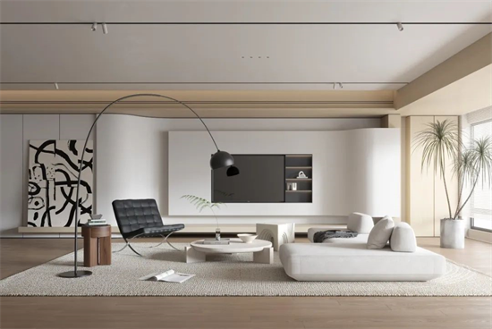 提前计算好电视墙的深度与电视机的厚度,将电视机嵌入电视柜或者大理石电视墙中,达到齐平或微内嵌效果,既提高了空间的整体性,也减少了电视机的突兀感,视觉上更为美观大方。