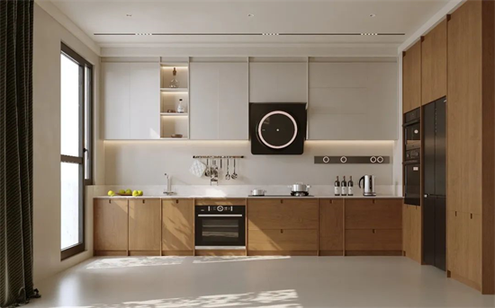 空间小、东西多是大多数厨房的通病,内嵌厨电是日常生活中比较常见解决办法,洗碗机、蒸烤箱、冰箱……都直接嵌入柜体,既不占厨房空间,操作使用也很方便,还能够有效避免油污,大大减少了清洁工作量。但是要注意的是,在定制柜子前必须要确定好电器的大小,同时预留好插座电位。像冰箱这种需要散热的家电,还不能完全与柜体贴合,四周需要预留10cm左右的距离。