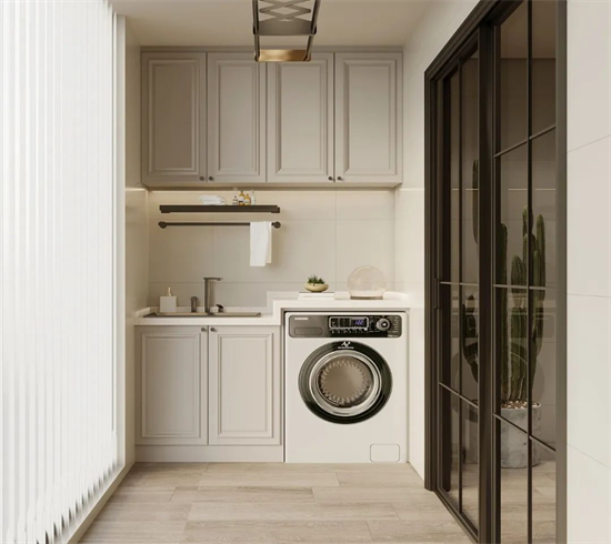洗衣机、烘干机也算是比较大的家电了,但它们的放置并没有固定区域,家政区、生活阳台、卫生间、厨房……都有可能,但不管在哪里,都会采用内嵌式设计,不仅节约了空间,也提高了居室的协调性和匹配度。