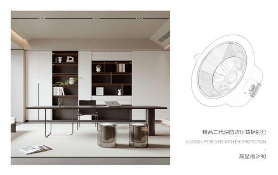 【开尔照明精品二代深防眩压铸铝射灯】深藏光源结构设计,大遮光角避免眼睛直视灯光带来的眩晕感、刺眼感,给眼睛最佳的舒适感觉。再以极窄边框嵌入式安装与整个空间结合起来,井然有序,彰显书房的严谨性和专业性。
