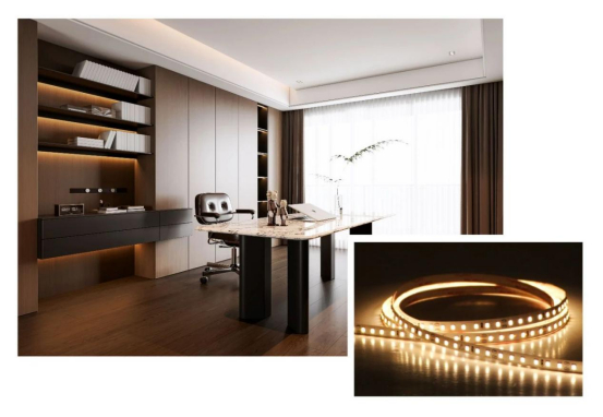 有强有弱才能称之为重点,所以不是放一盏灯就能成为重点的。为了不喧宾夺主,书房其他区域的用光就一定要克制。所谓克制,可以视为补充用光,补充用光的关键字是“柔”,开尔照明【精品系列低压灯带】90高显指,无频闪无蓝光,书房补充光非它莫属。